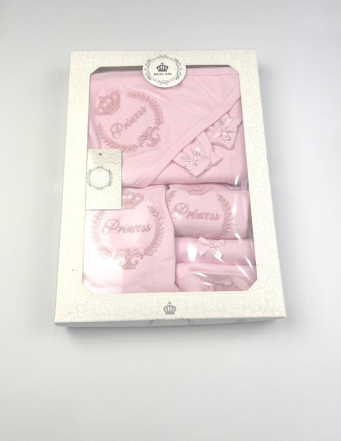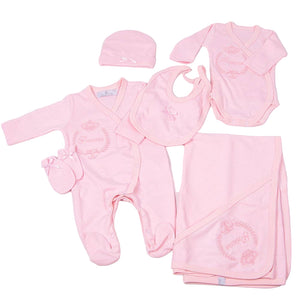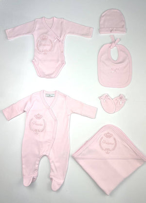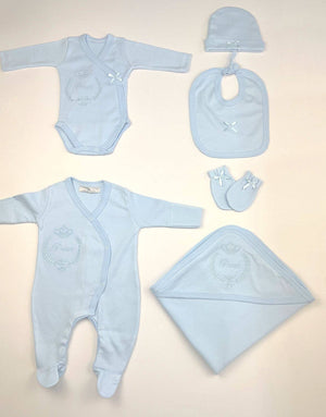 Six-piece soft cotton jersey babysuit set. This consists of a hooded blanket, babygrow, bodysuit, mittens, hat and a bib. The blanket, babygrow and bodysuit each have an embroidered logo crest, pink 'princess' for girls, and blue 'prince' for boys.