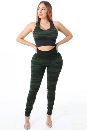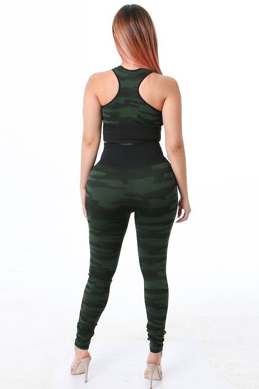 CAMOUFLAGE PATTERN SLEEVELESS RACER BACK CROP TANK TOP AND HIGH WAIST LEGGING 2 PIECES SET.