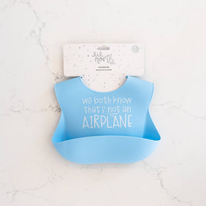 For the smart lil ones - check out our "we both know that's not an airplane" silicone bib in light blue! Our silicone bibs help keep your lil one clean while adding a dash of fun to mealtime! Our bibs feature an adjustable neck strap and a deep front pocket to keep your lil one clean and comfortable! All our bibs are made from 100% food grade silicone and are super easy to wipe clean! Product details & care: -Waterproof -100% food grade silicone -Free from bpa, pvc, phthalates and toxic metals -Recommended for age 6 months and up -Reinforced adjustable button holes -Deep front pocket to help catch food and keep your lil one clean -Easy to fold for travel -Hand wash with soap or place in the top rack of the dishwasher -Ready to gift packaging -Tested for safety by sgs canada