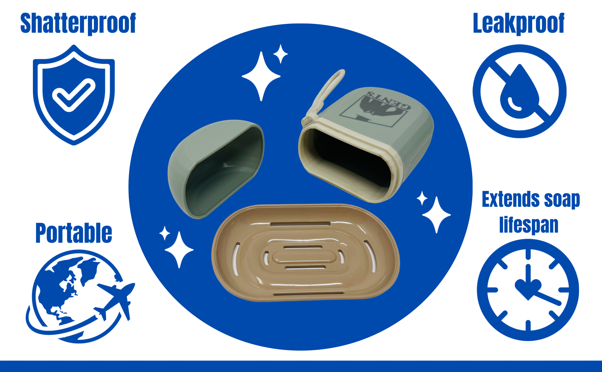 Leakproof Travel Soap Case with Draining Tray – Hard Shell Bar Soap Holder with Strap – Portable, Shatterproof, and Waterproof – Extends Soap Life – Ideal for Home, Gym, or Travel ✅ Leakproof & Durable – Designed with a secure seal to keep water in and leaks out, even when tossed in a gym bag or suitcase. ✅ Includes Draining Soap Tray – Keeps your bar dry and elevated between uses, extending the life of your soap and preventing soggy messes. ✅ Hard Shell Protection – Crush-resistant case protects your soap from damage, making it perfect for travel or on-the-go lifestyles. ✅ Portable & TSA-Friendly – Lightweight, compact, and designed with a hanging strap for easy storage in your shower, locker, or carry-on. ✅ Versatile & Eco-Friendly – Works with most standard soap bars. Reusable design helps reduce waste Our GENTS Travel Bar Soap Dish Container with Lid great for Camping, Travel, Hiking, Gym or Just on the GO! Has handle and also can be attached to a back pack