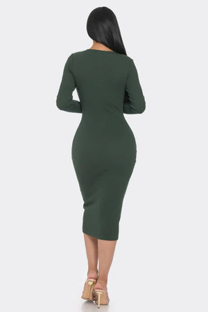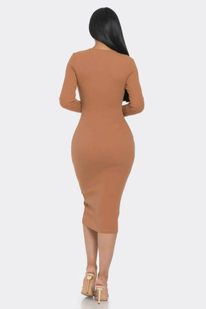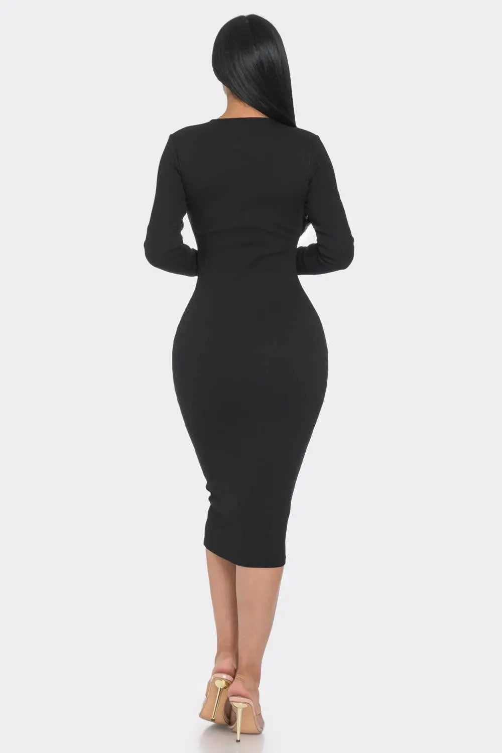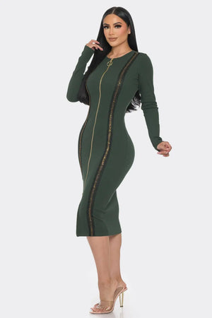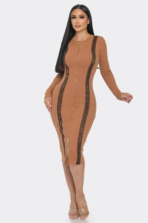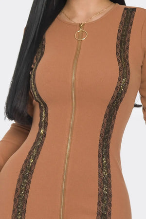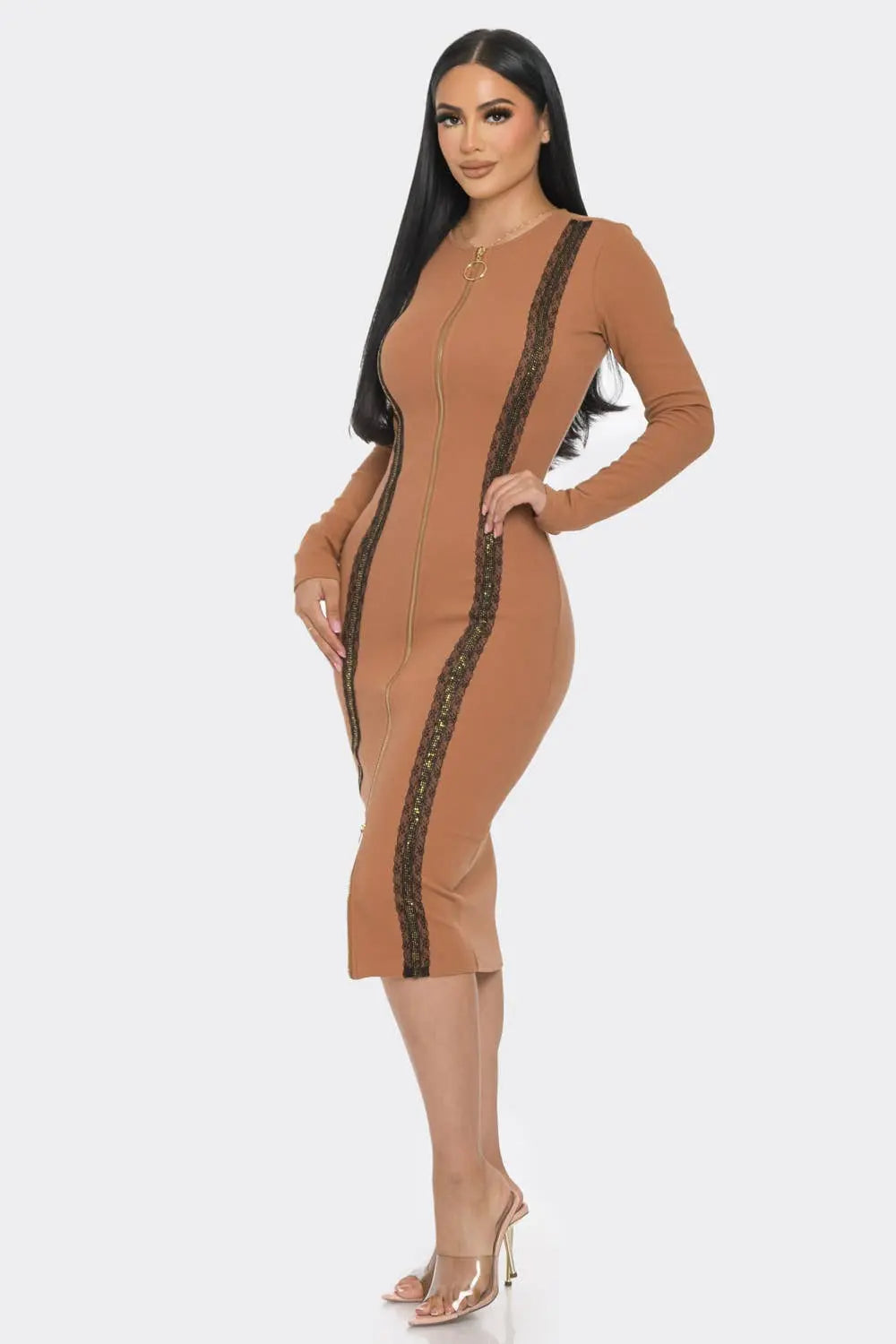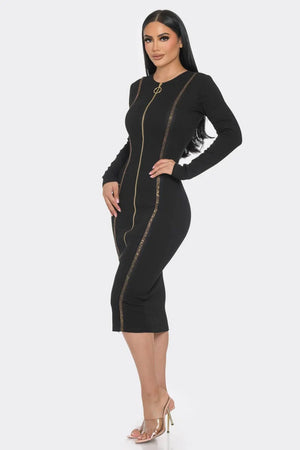 FEATURING A LONG SLEEVE FIGURE-HUGGING MIDI DRESS WITH GOLD TRIM LACE DETAILING AND 2 WAY GOLD HOOP ZIPPER SELF: 95% POLYESTER 5% SPANDEX STYLE NO: CD50497
