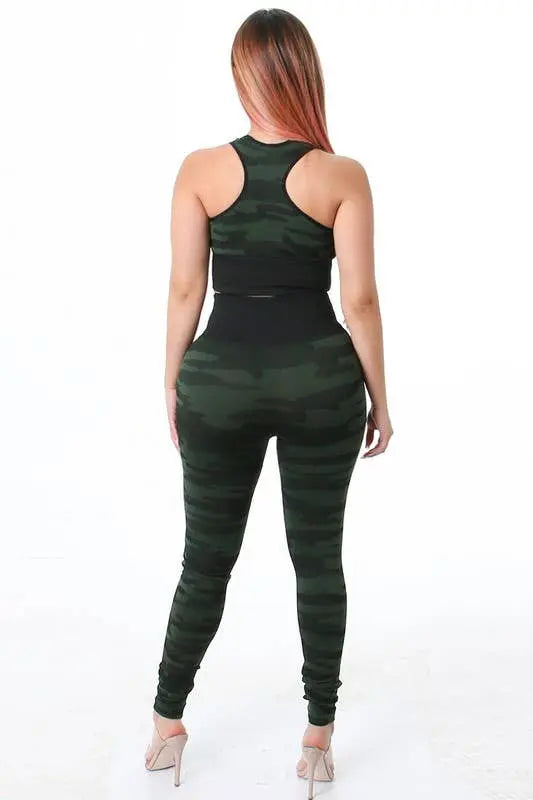 CAMOUFLAGE PATTERN SLEEVELESS RACER BACK CROP TANK TOP AND HIGH WAIST LEGGING 2 PIECES SET.
