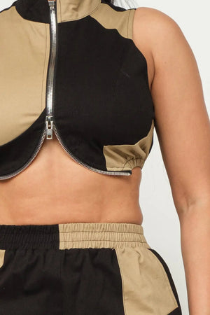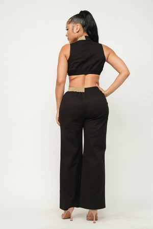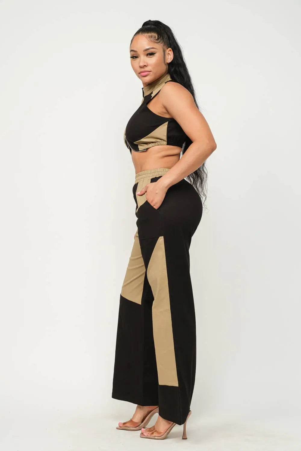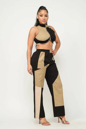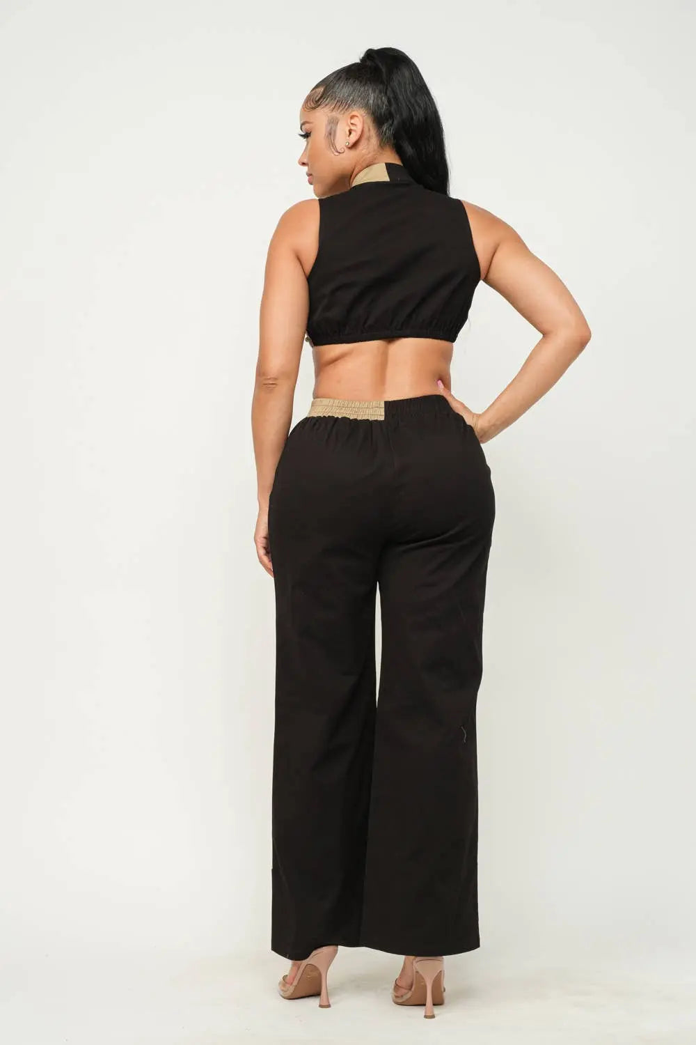 Cotton Twill Fabric Color Block Sleeveless Front Functional Zipper Mock Neck Crop Top And Color Block Elastic Waistband Side Pockets Flare Pants Set