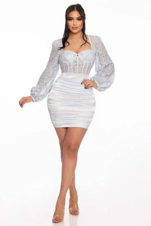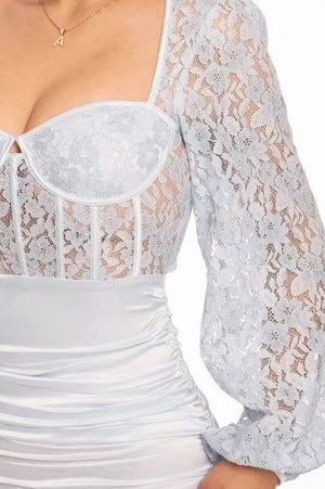 MADE FROM STRETCHY LACE AND SATIN FABRIC, A PULLOVER DESIGN ALONG WITH RUNCHED DETAILS, AND A MINI LENGTH ACCCUT OUT RUCHED PARTY MINI DRESS ENTED WITH A CURVED HEM. SELF: 90% POLYESTER 10% SPANDEX CONT: 70% COTTON 30% NYLON CD5314