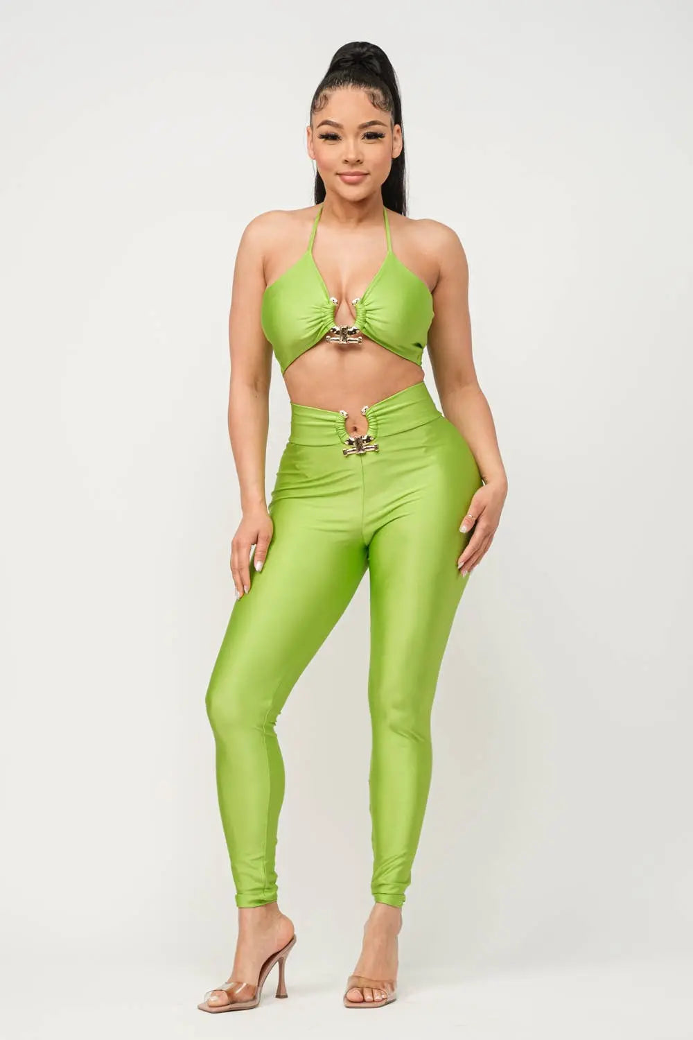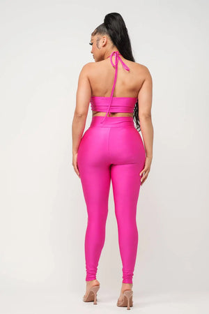 Shiny Yoga Fabric Front U-Ring Trim Detail Open Back Spaghetti Tie Bra Top And Front U-Ring Trim Detail Leggings Set Model: 5' 7, Bust 35, Waist 27, Hips 37.6