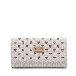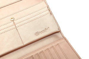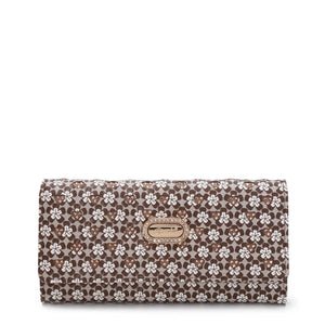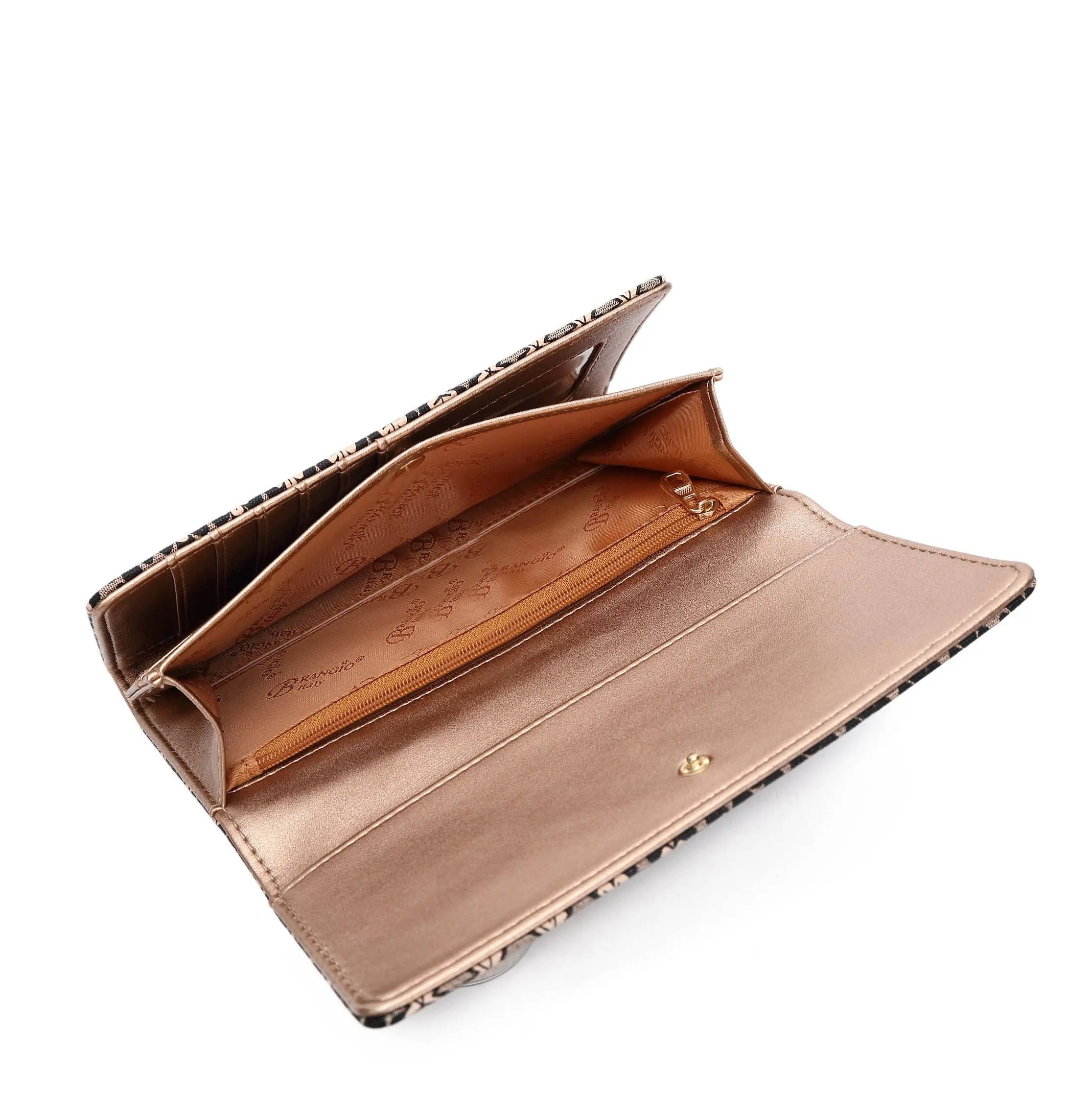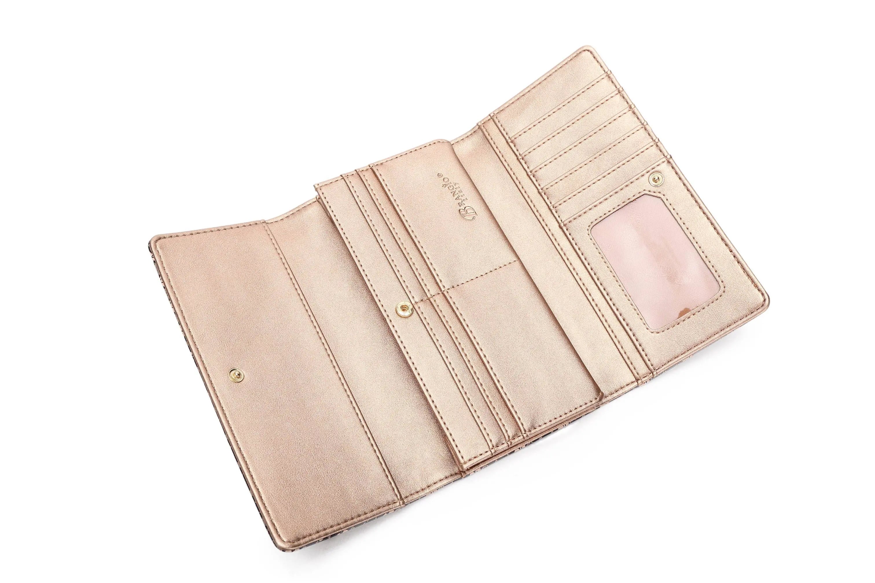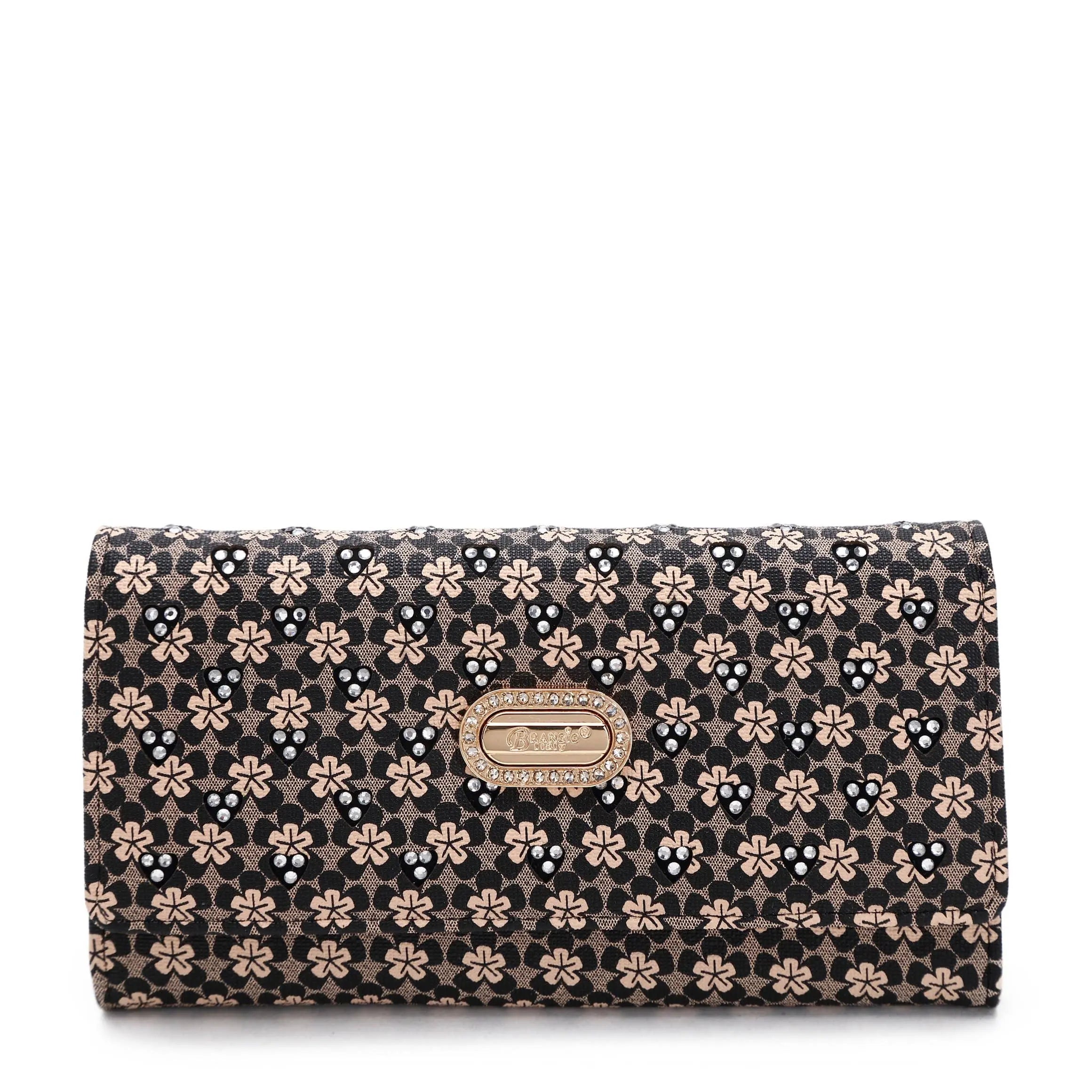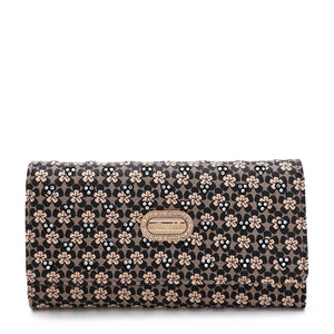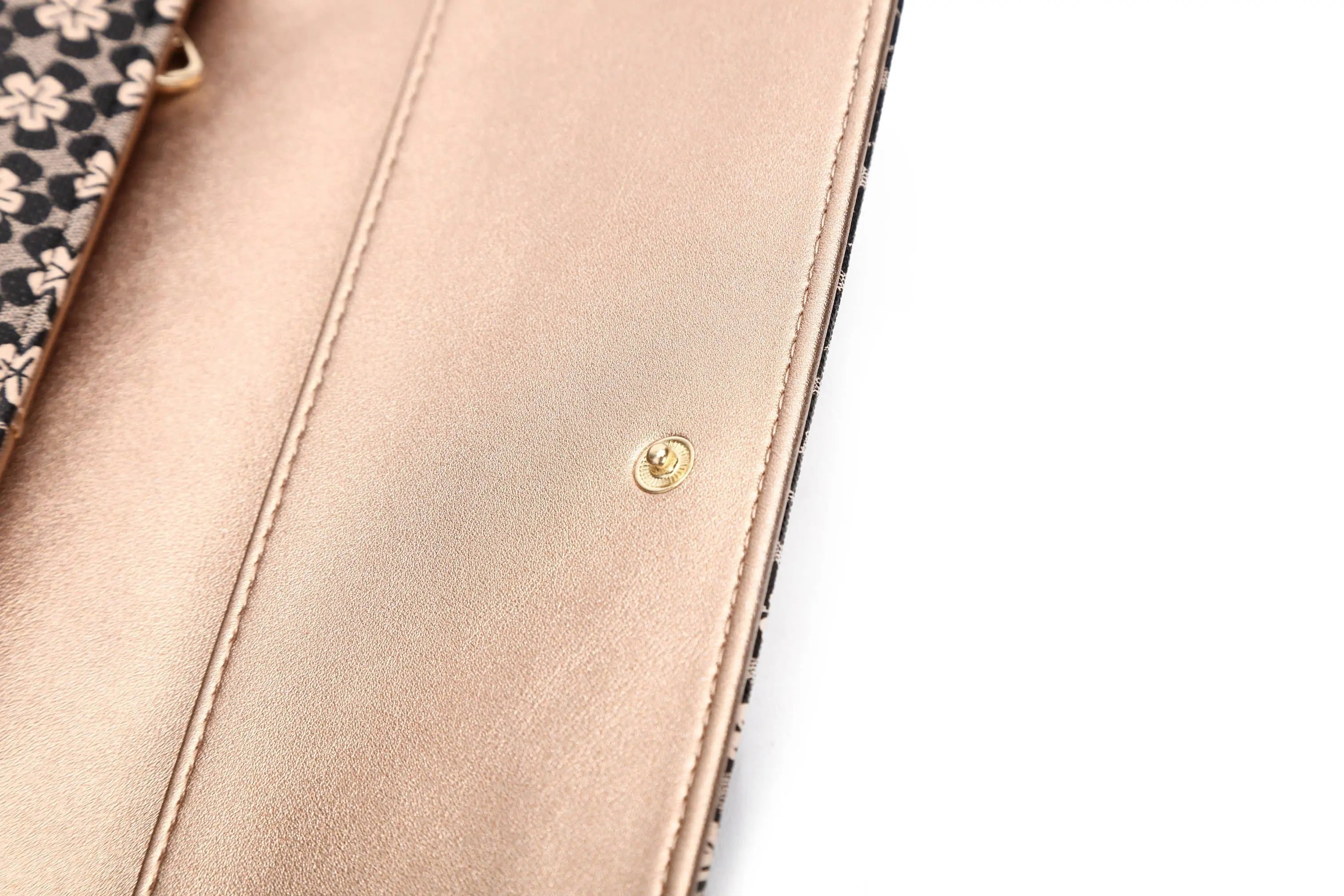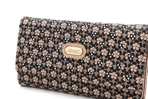 This sophisticated wallet combines style and functionality with its beautiful brown floral pattern and sparkling detailing. The compact design offers enough space to hold your essentials while adding a touch of luxury to your everyday ensemble. Featuring a gold-tone clasp with crystal embellishments, this wallet adds elegance to your accessories collection. Perfect for both casual outings and special occasions, it’s the ideal blend of fashion and practicality.