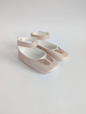 Baby girls soft shoe, easy velcro-ankle strap fastening for more support, finished with glitter butterfly design.