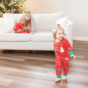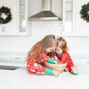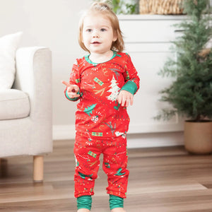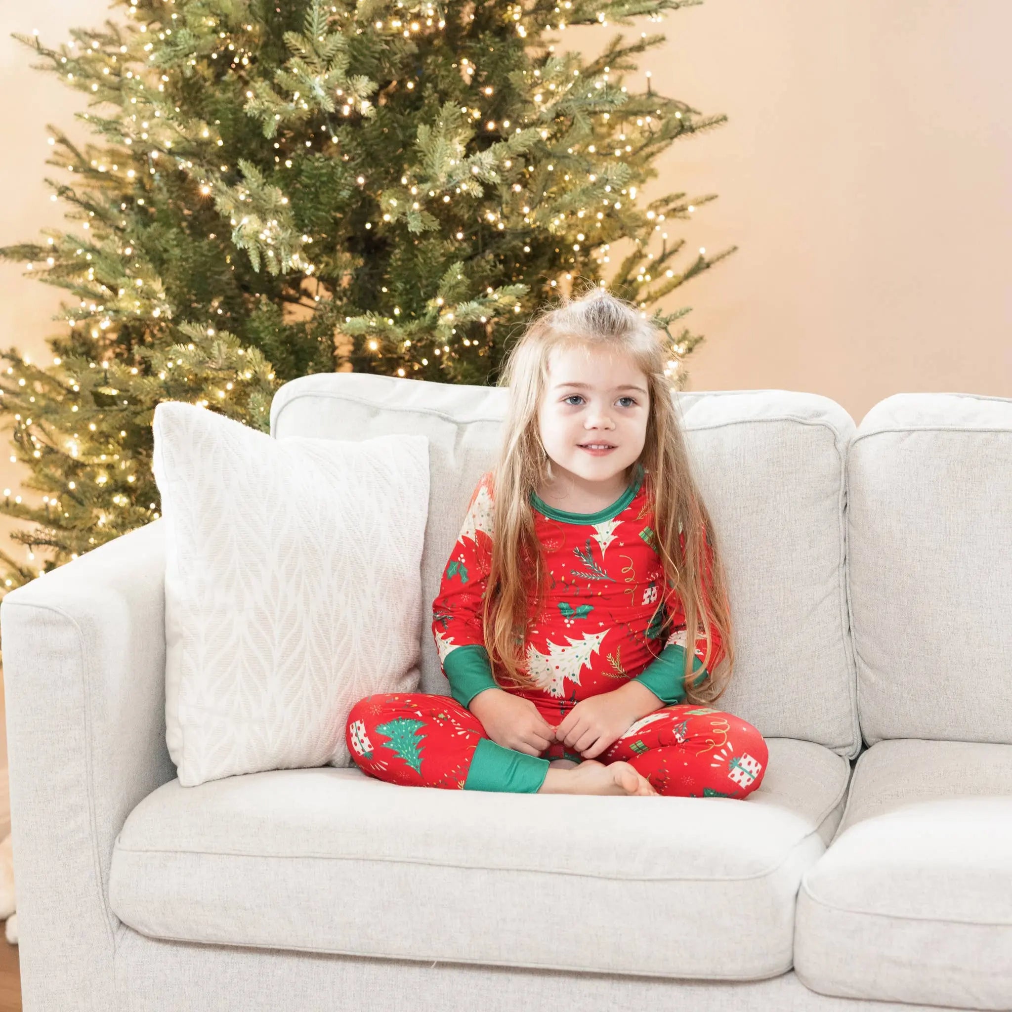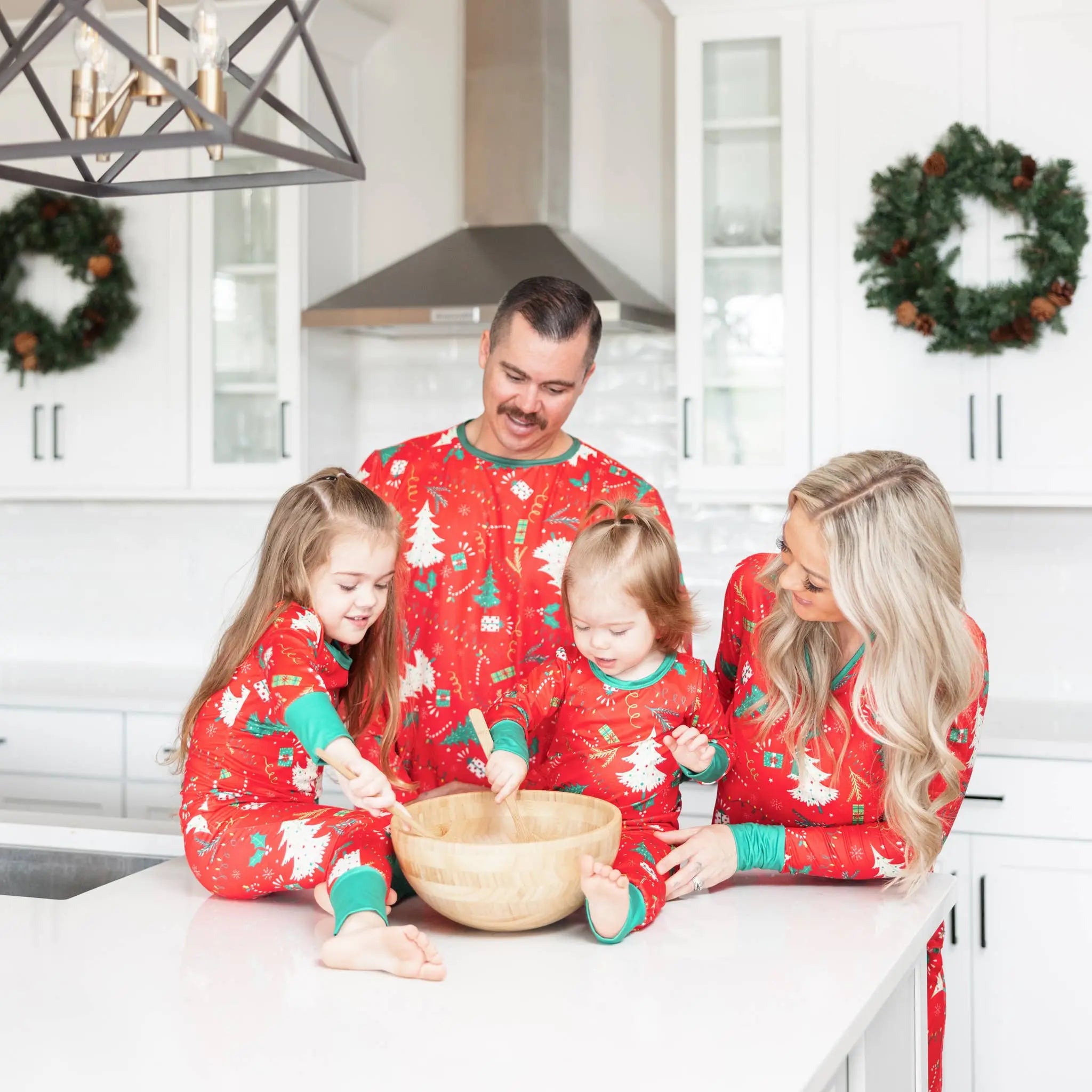 Holiday Cheer! This festive print will get the whole family in the holiday spirit! Featuring holiday icons like decorated trees, presents, candy canes and mistletoe, these family matching jammies will have the whole family looking festive and comfy! Features: - 95% Modal, 5% Spandex - The Modal fabric we use is not only eco-friendly and one of the softest fabrics made, it is also lightweight, hypoallergenic, moisture-wicking, and breathable! - No snap, buttons or interior tags - Snug fit in accordance with all CPSC safety regulations (we do not use flame-retardants or chemicals)