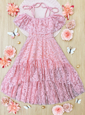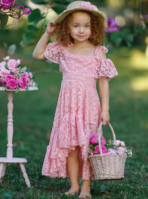 Cold shoulder lace maxi dress with ruffled hi-lo hem * THE prettiest dress of the season is here! Our pink lace maxi sundress has all the right details—a cold shoulder style, cute tie straps, and a ruffled hi-lo hem—to make it the most snag-worthy "IT" dress for your precious one. Grab it while you can! * Its trendy silhouette and gorgeous lace fabric showcase a custom design look guaranteed to be a big hit for spring and summer! * Buttery soft fabric and its relaxed fit give her the freedom to move and play. * Perfect for spring, summer, casual days, birthday parties, and fashion photoshoots * Includes one dress * Made in the USA with Love