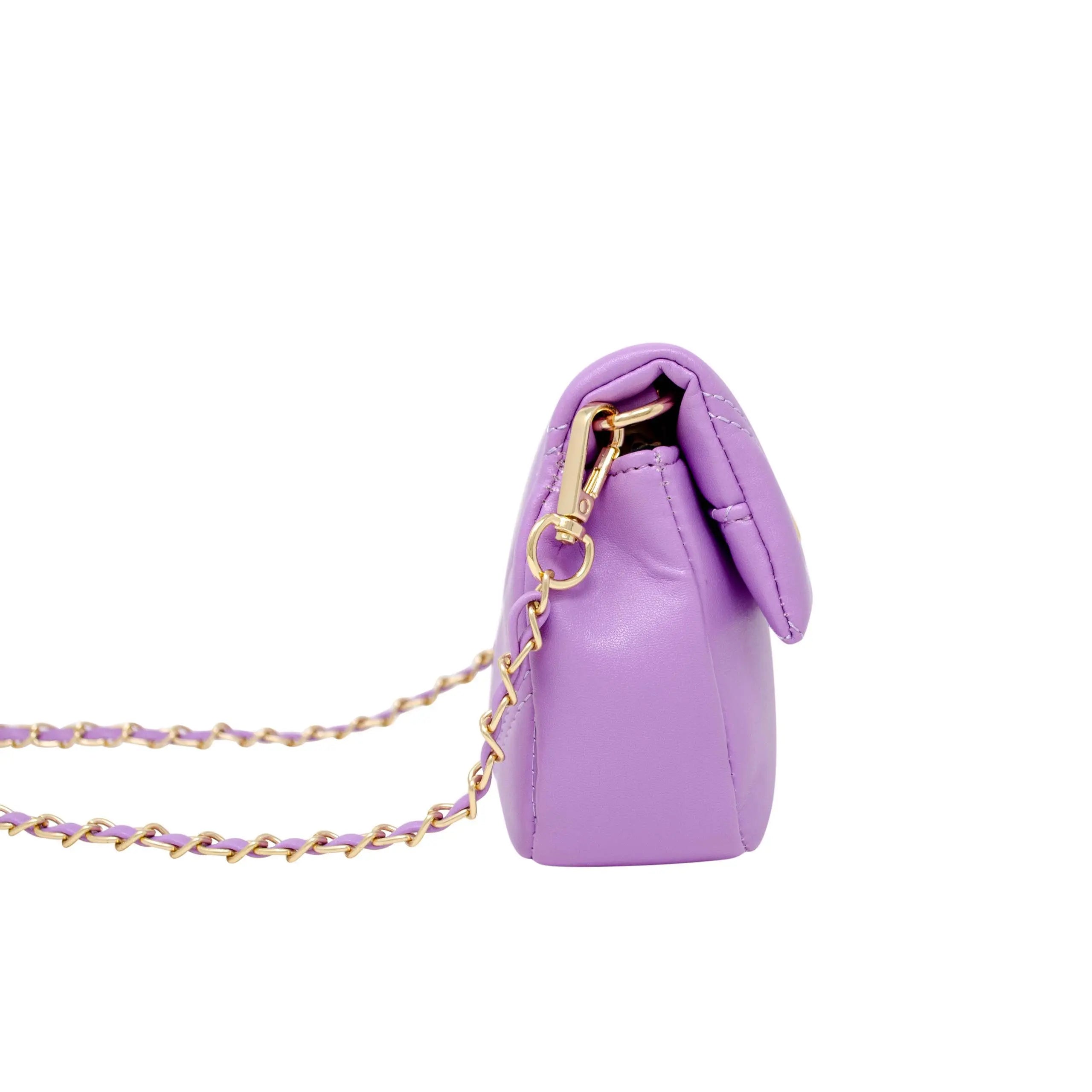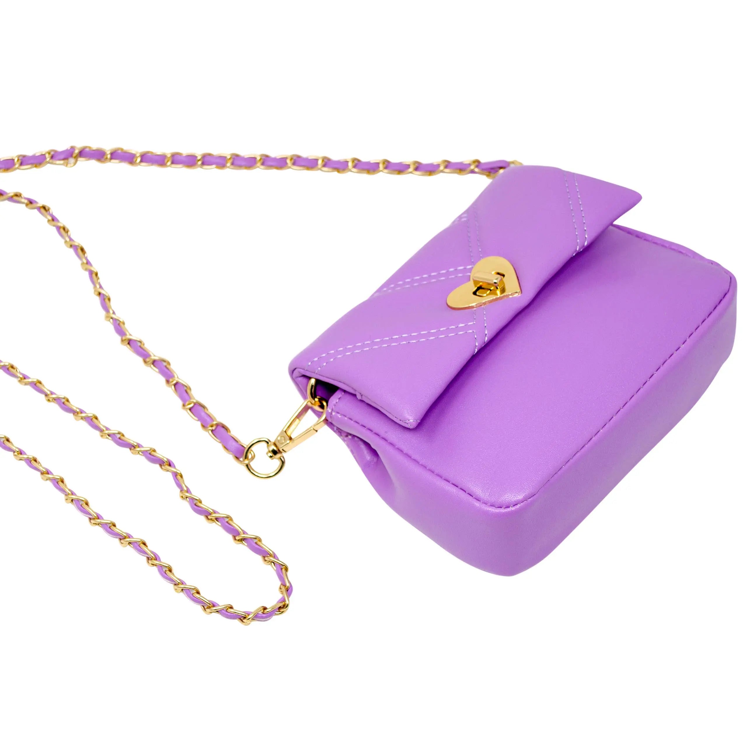 This purse features a very soft quilted texture. The front flap has a heart shape twist lock. The inside has a separate zipper compartment for coins. It comes with a beautiful chain that has a matching interwoven leather strap. Recommended for ages 3+
