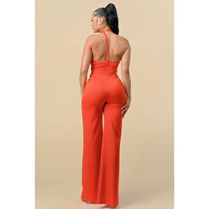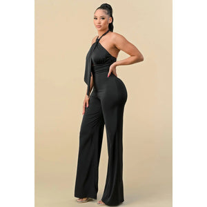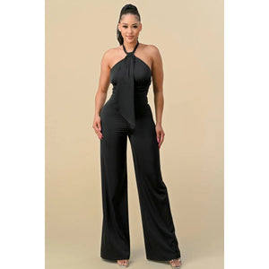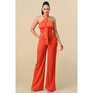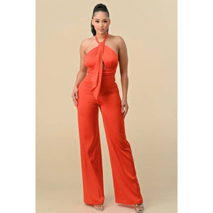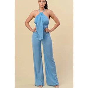 HALTER NECK FRONT RIBBON DETAIL CHAIN TRIM JUMPSUIT