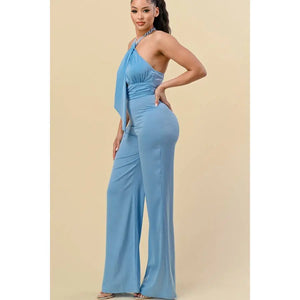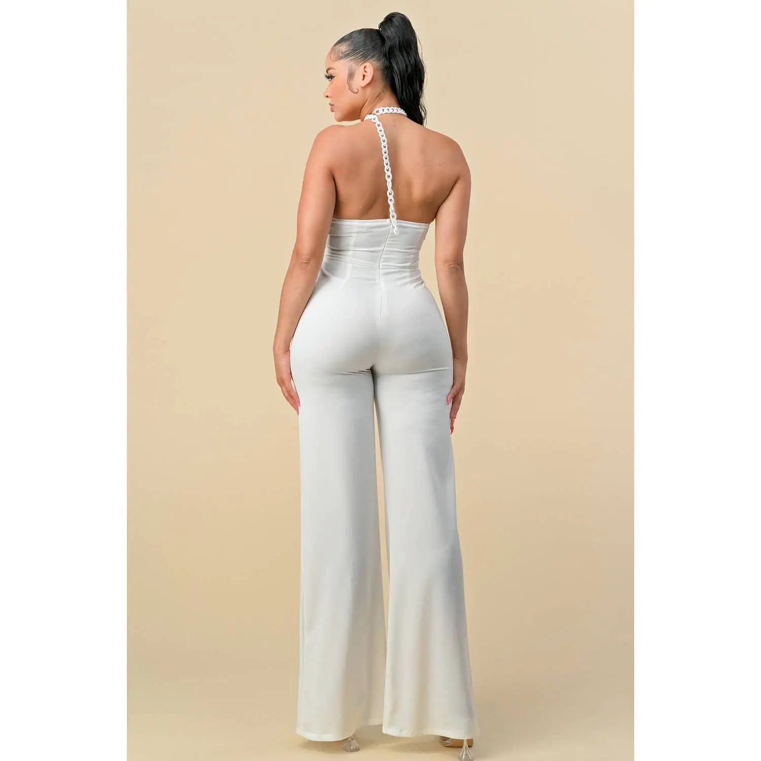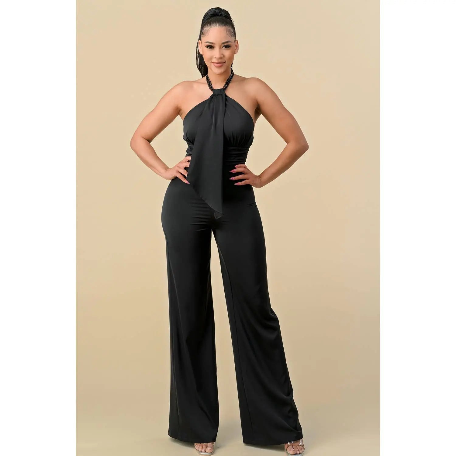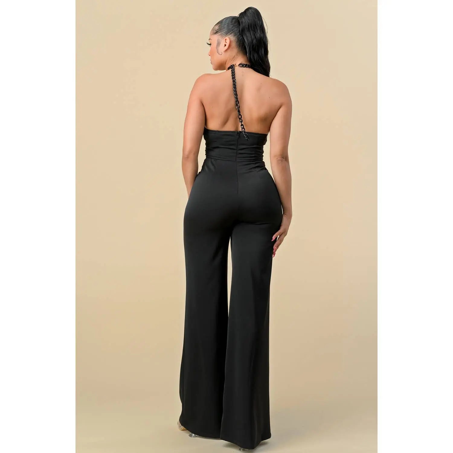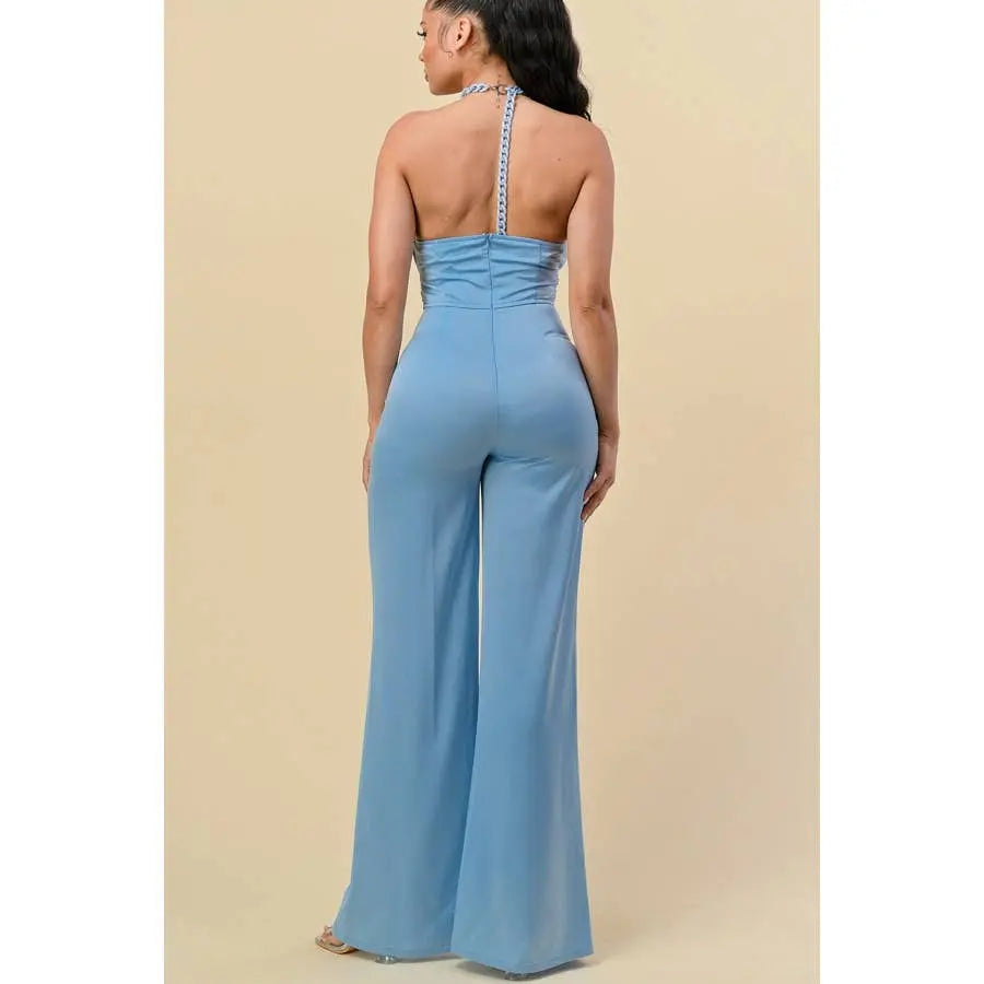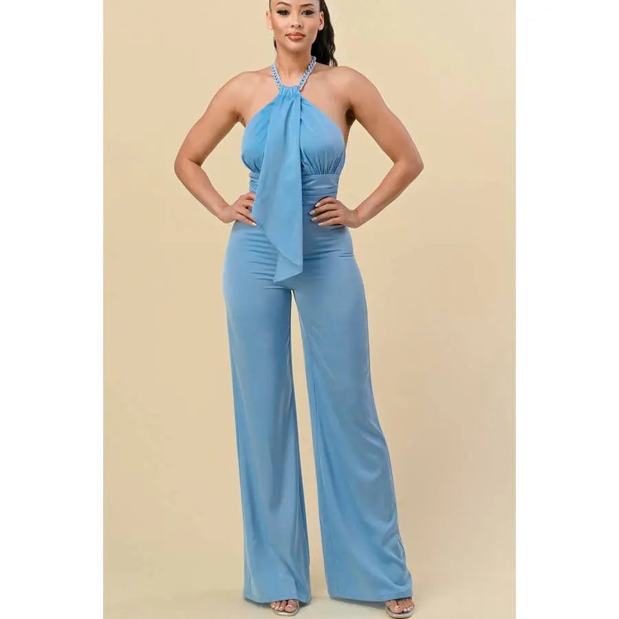 HALTERNECK RIBBON DETAIL CHAIN TRIM JUMPSUIT